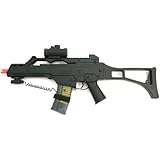 DescriptionFull scale 1/1 size airsoft replicaVelocity: 260fps using 0.12g BB, 200 fps using 0.20g BBUp to 35meter rangeSpring operatedLength: 72cmConstructed from tough black and clear ABS anti-shock resin plasticTransparent 21BB magazineInternal weights for increased sturdinessRemovable stockRemovable front sectionSafety modeWe recommend using quality 0.20g BB with this machine gunManufactured by Double EagleWeaver rail along top and on the bottom of the front endRifle slingScope with electric LED crosshair and weaver mountLaser with weaver mountSpare batteries for scope and laserIncludes 200BB pellets (approx)