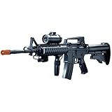 Description A 1:1 scale replica of an actual M4 rifle, this Double Eagle electric airsoft gun is remarkably authentic. The M4 fires round 6mm plastic pellets known as BBs, which are propelled out of the gun by compressed air. The advantage of the airsoft rifle, however, is that players can safely train, simulate, or play with the gun without fearing serious injury. The M4 looks, feels, weighs, and functions just like a real firearm, but is built for casual recreation rather than weaponized use. In fact, the only way you can typically tell a real-steel firearm from an airsoft gun is the blazing orange tip and the BBs that fire when you pull the trigger. The M4--which is made of ABS plastic--comes packed with 100 pellets in an attractive color box, and features both semi-auto and fully auto modes. Includes Flashlight Magazine 2 - Interchangeable Barrels Red Dot Scope No Laser Safety Glasses Shoulder Strap Battery & Charger Removeable Front Handle Pack of BBs All Batteries Included