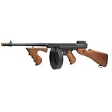 Al Capone was public enemy No. 1, and this is what he used to mow down his enemies on the streets of Chicago. The Thompson was invented by Brig. Gen. Thompson, but WWI ended before the general could get it into production. Thompson marketed the gun to civilians, and Al Scarface Capone was only too happy to use it! If you've got competition on the airsoft field, this Tommy gun will clear them out. This realistic replica comes with everything but a violin case! Thompson M1A1 submachine gun replica Auto-electric gun (AEG) Full-/semi-auto 450-rd drum mag Full-metal body Wood-grain plastic buttstock & grips look very realistic Metal gearbox Reinforced steel gears Metal bushings Rear sight adjustable for windage & elevation Vertical foregrip for better balance 1.3 joules of energy 465 fps with .12g BBs, 350 fps with .20g BBs BAX system for better BB stabilization Includes 8.4v 1100 mah Ni-MH battery pack, 250 mah charger (4.4 hrs charge time)Drum mag info: Rotate the key only in the direction of the arrow. Do not rotate the key in the opposite direction or you will break the magazine!Battery info: The battery compartment in the rifle's butt includes a dark grey foam insert. Remove it with a corkscrew or long wooden screw if you'd like to use a larger battery such as SDERBAT6-MINI.... ... Thompson M1928 AEG...